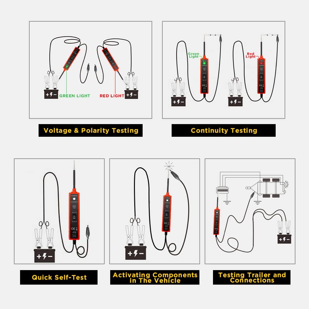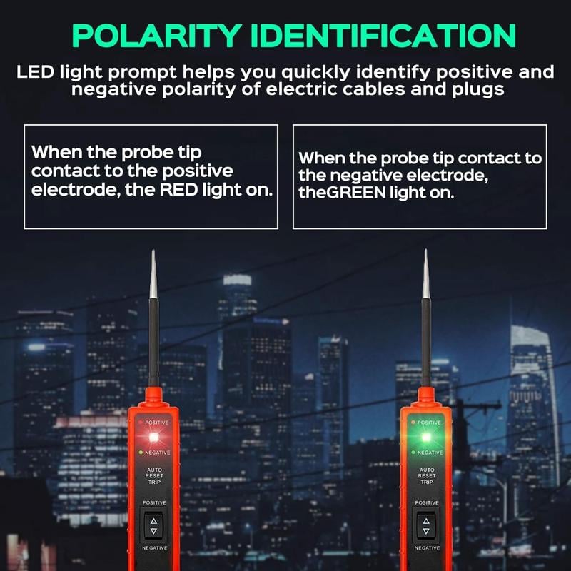 The power circuit probe tester is made of insulating material and high-quality stainless steel tip, which can help you quickly identify the positive and negative polarity of the vehicle cable and plug.